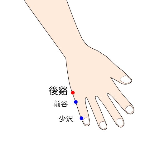少沢(しょうたく)の「少」は、「小」と同義で、太陽小腸経が小指にあることを意味し、「沢」は、潤沢の意で、経気が心経から最初に流れ込む経穴なので、気血が潤沢であるため名付けられた。