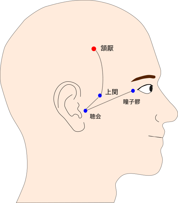 額角髪際の上0.5寸にある頭維(胃経)から曲鬢を結ぶ曲線上を4等分した上から4分の1のところに取る。