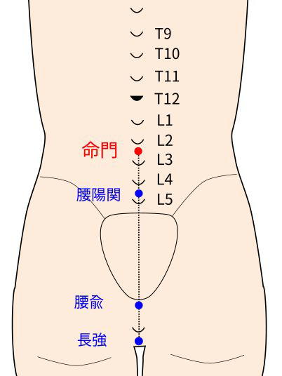 命門(めいもん)は両腎兪の間にあり、腎気は一身の本で、生命の重要な門戸であることから名付けられる。